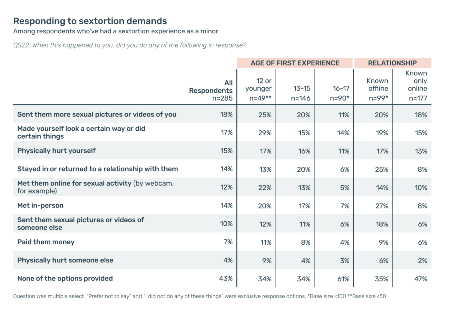 Thorn’s research found that 39% of victims were coerced into sending more sexual images, and 31% were pressured to meet offline. Others were blackmailed into sexual acts over video, staying in a relationship against their will, or even handing over money and gift cards.